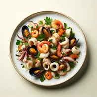 Una ensalada fresca y sabrosa, compuesta por una variedad de mariscos delicadamente cocinados mezclados con verduras crujientes y sabores mediterráneos. Camarones, calamares y mejillones se unen a tomates cherry, pepinos cortados en cubitos, cebolla morada en rodajas finas y perejil fresco. Todo se adereza con zumo de limón fresco, aceite de oliva virgen extra y una pizca de sal marina. Una explosión de sabores marinos perfecta para un almuerzo ligero o un refrescante aperitivo.