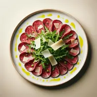 Fatias finas de carne crua marinadas em suco de limão, azeite de oliva extra virgem e cobertas com flocos de Parmigiano Reggiano, rúcula fresca e uma pitada de pimenta preta. Um prato leve e requintado, perfeito como entrada ou prato principal.